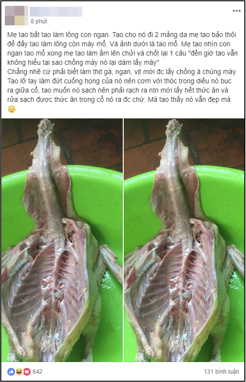 Theo như bài đăng cô gái tên T.H được mẹ giao cho nhiệm vụ làm lông ngan. Nhưng do vụng về nên T.H đã làm bay luôn 2 miếng da. Sau đó, cô bị mẹ xua đuổi không cho vặt lông nữa mà để cô nhận nhiệm vụ mới: mổ ngan. Tất nhiên là với thành quả này, T.H đã nhận về một cơn thịnh nộ từ người mẹ yêu quý của mình, thậm chí mẹ cô còn thắc mắc không biết vì sao con gái lại có người chịu "rước" đi.