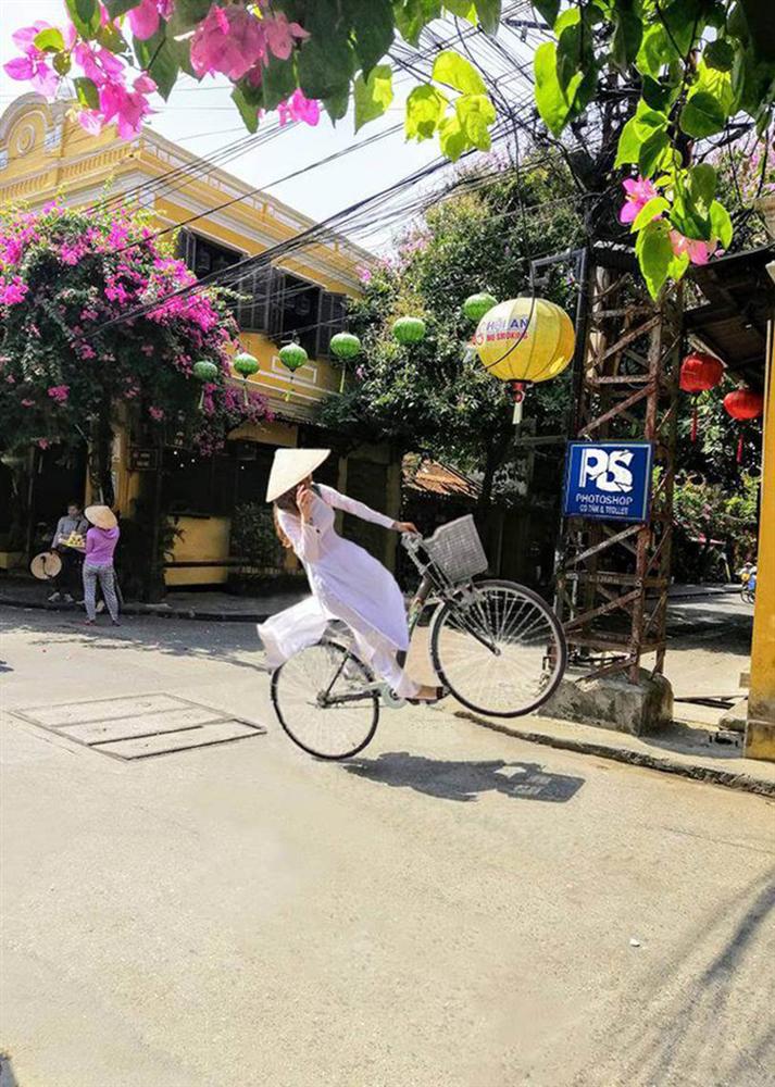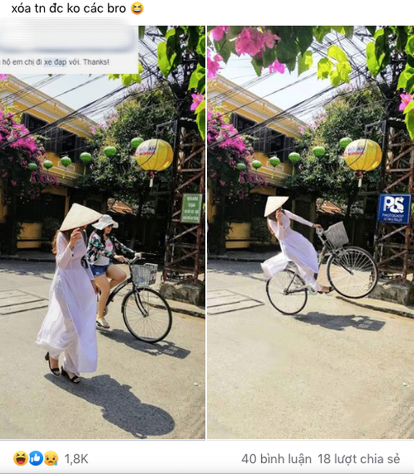 Mới đây, cộng đồng mạng lại được phen nhộn nhịp hẳn nhờ hình ảnh chỉnh sửa "có tâm" dành cho một cô gái trẻ trung, xinh đẹp. Vốn là cô gái này chỉ nhờ dân mạng xóa hộ người đi xe đạp ở bên cạnh để bối cảnh đẹp một chút, phù hợp với tà áo dài thướt tha của cô.