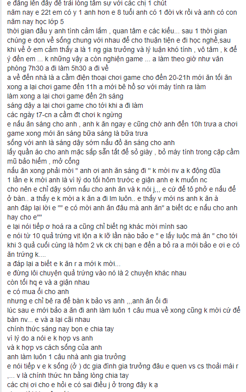 "Thời gian đầu yêu anh tình cảm lắm, quan tâm em các kiểu. Sau một thời gian chúng em dọn về sống chung với nhau để cho thuận tiện em đi học nghề. Sau khi về ở, em thấy anh là 1 người gia trưởng, lý luận khó tính, vô tâm... Không những vậy, anh còn nghiện game khủng khiếp", cô gái viết.