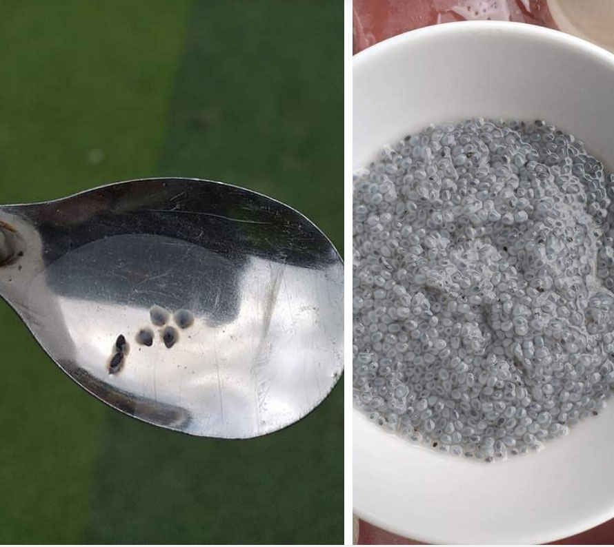 Hạt cây húng quế (bên trái) nở ra không đẹp mắt như hạt é (bên phải).