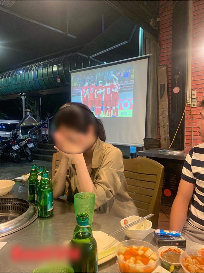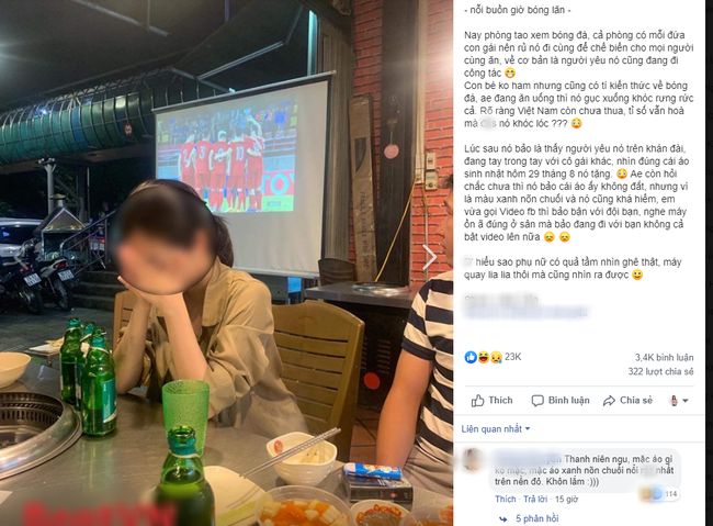 Hỏi ra mới biết, cô ấy vừa nhìn thấy người yêu mình trên tivi nắm tay một người con gái khác đang hò hét cổ vũ cho đội tuyển Việt Nam. Cô gái nhận ra chắc chắn là người yêu mình nhờ chiếc áo màu nõn chuối mà cô từng mua tặng.