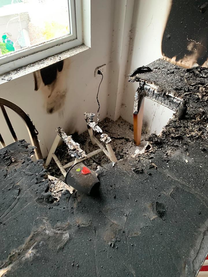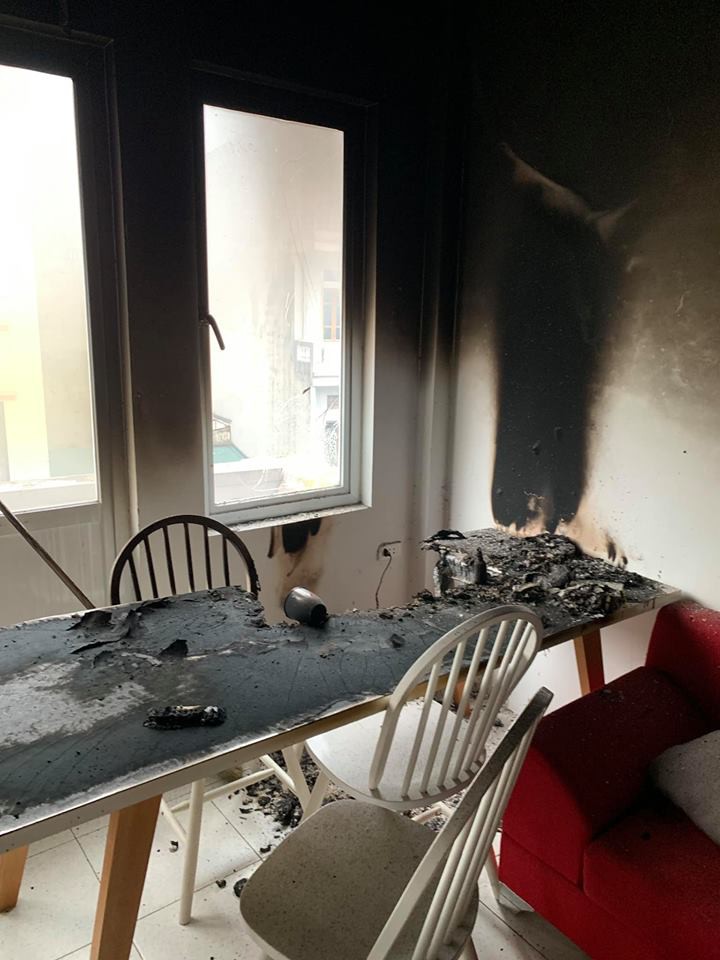 Nhìn những hình ảnh đăng tải có thể thấy, sau khi chiếc loa M.K bất ngờ phát nổ, những đồ đạc xung quanh đã cháy đen, 1 phần bàn bị mất, tường và trần nhà cũng bị ám khói đen, chiếc điều hòa trên trần nhà bị cháy nham nhở.
