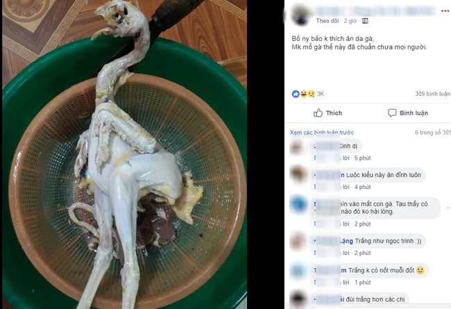 Nguyên văn dòng caption ngắn cùng bức ảnh ''thành quả'' gà trụi da, chàng trai đăng tải trên mạng xã hội với nội dung: ''Bố người yêu bảo không thích ăn da gà. Mình mổ gà thế này đã chuẩn chưa mọi người?''.