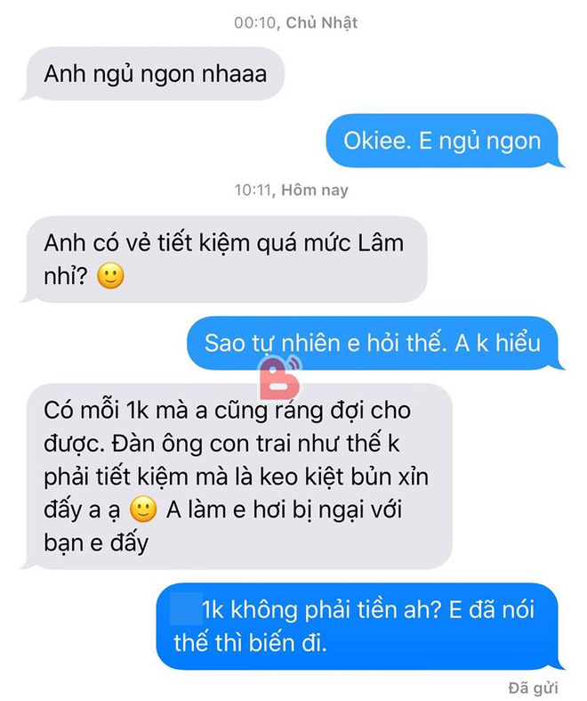 - Có mỗi 1 nghìn mà anh cũng ráng đợi cho được. Đàn ông con trai như thế không phải tiết kiệm mà là keo kiệt, bủn xỉn đấy anh ạ. Anh làm em hơi bị ngại với bạn em đấy.