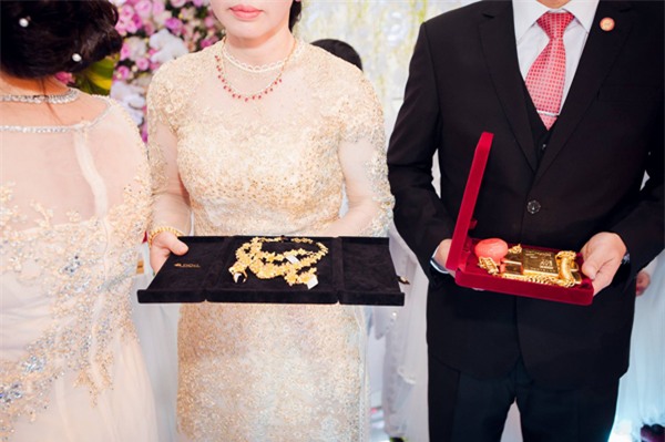 Tiệc cưới hơn 300 mâm cỗ, bình quân mỗi mâm 6 triệu đồng, riêng tiền rượu ngoại được bạn bè nữ đại gia tiết lộ lên tới con số gần 3 tỷ đồng. Số tư trang cô dâu chú rể nhận được là 60 cây vàng, đồng thời chiếc xe rước dâu cũng có giá trị trên 10 tỷ đồng.