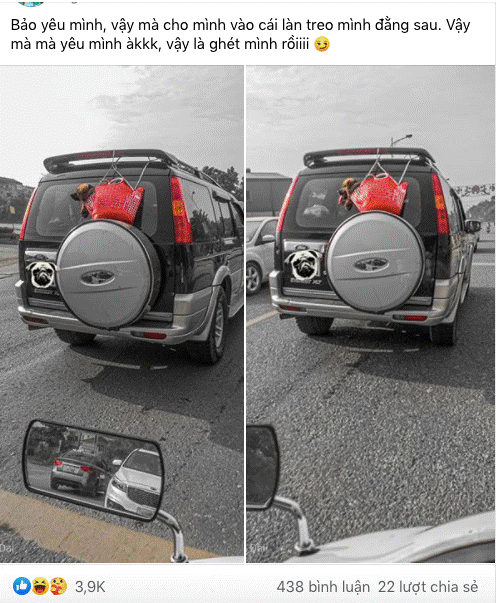 - "Ôi thương quá, có lẽ em cún này say xe nên đành phải buộc ở phía sau cho thoáng rồi".