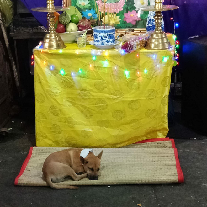 "Chủ mất, suốt từ qua đến giờ bé Lu nhịn cả ăn nằm cạnh di ảnh không chịu rời xa. Khi nào thầy đọc kinh lại chạy ra chiếu ngồi nghe.