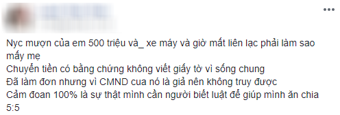 "Người yêu cũ mượn của em 500 triệu và xe máy. Giờ mất liên lạc phải làm sao mấy mẹ? Chuyển tiền có bằng chứng không viết giấy tờ vì sống chung. Đã làm đơn nhưng vì CMND của nó là giả nên không truy được. Cam đoan 100% là sự thật mình cần người biết luật để giúp mình, ăn chia 5:5".