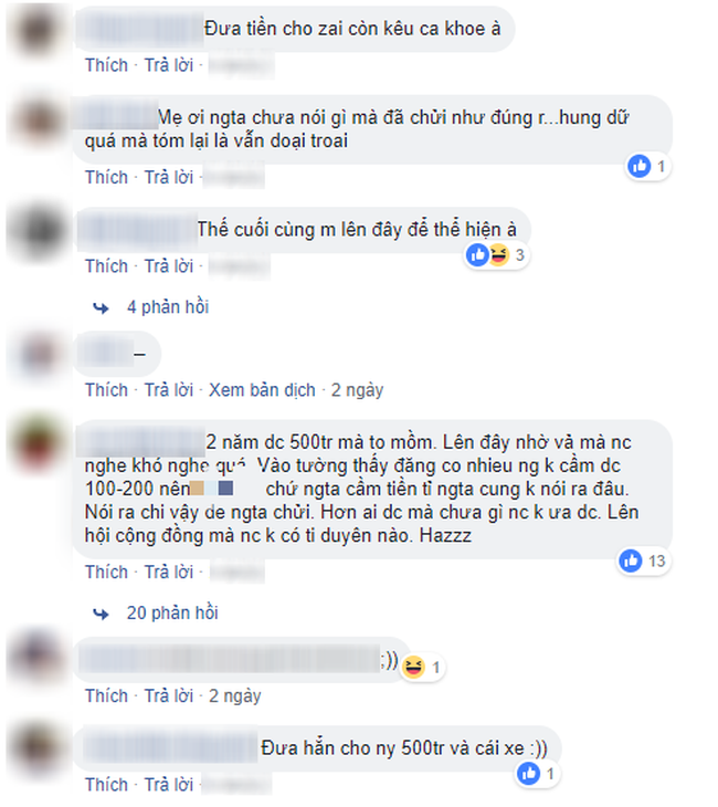 Chính vì sự dại dột này, câu chuyện trên sau khi được đăng đàn ít lâu đã thu hút được rất nhiều lời mắng nhiếc, chê trách của cộng đồng "500 chị em" trong hội nhóm đăng tải: "Dại thế này thì bây giờ ba hồn chín vía gọi nó ra đòi cũng đừng mong nó trả", "có đi mà đòi, khôn thì nhờ, dại thì chịu", "chả biết nghĩ gì mà đem 500 triệu cho vay, không một tờ giấy", "đọc mà phát cười, đời chuyện gì cũng có thể xảy ra", "chả biết mắng cô này dại hay khen anh kia khôn nữa",...