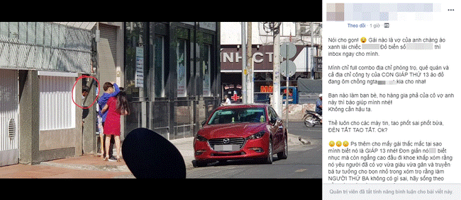 "Nói cho gọn! Gái nào là vợ của anh chàng áo xanh lái chiếc xe đỏ này thì inbox ngay cho mình. Mình chỉ đầy đủ địa chỉ phòng trọ, quê quán và cả địa chỉ công ty của CON GIÁP THỨ 13 áo đỏ đang ôm chồng người ta kia cho nha! Bạn nào là bạn bè, họ hàng gia phả của cô vợ anh này thì báo giúp mình nhé! Không cần hậu tạ.