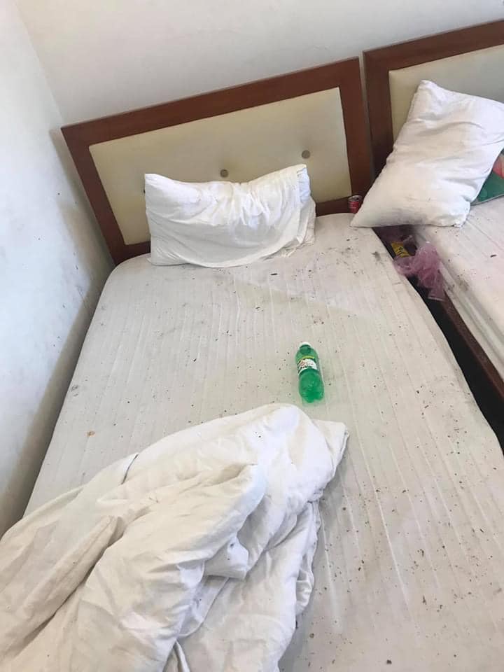 Dưới sàn nhà la liệt vỏ bành kẹo, túi nylon, túi đựng đồ ăn. Đặc biệt, trong phòng còn đầy vỏ bao thuốc lá cũng như tàn thuốc rơi đầy ra sàn. Đồ đạc trong phòng cũng rất lộn xộn, chăn màn không vo tròn 1 cục vứt trên giường. Chiếc ga giường trắng tinh cũng đổi màu sau cuộc vui của nhóm người thuê phòng.