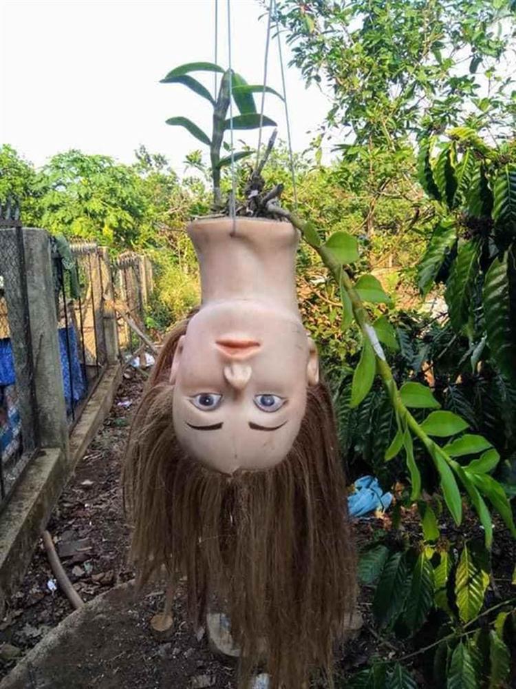 Chẳng là, chậu lan này không "bình thường" như những chậu lan cảnh mà người ta thường nhìn thấy, nó khác biệt ở chỗ, chủ nhà đã tận dụng luôn chiếc đầu... ma nơ canh với mái tóc dài vàng óng để... đựng lan. Đáng nói, mắt, mũi, miệng trên khuôn mặt con ma nơ canh này nếu nhìn ban đêm hay chập choạng tối lại giống y như... đầu của con người. Trong khi đó, đầu con ma nơ canh này lại được chủ nhà treo ngược xuống dưới để đựng cây lan.