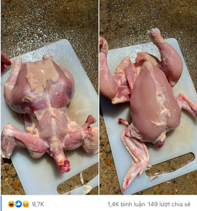 Hình ảnh mà cô gái chia sẻ cho thấy có một con gà đã được làm lông sạch sẽ. Đáng chú ý, dù đã được làm sạch lông nhưng con gà này lại "biến dạng" vì phần da bên ngoài bong tróc nhìn rất mất thẩm mỹ. Chưa kể, đầu cánh thì cụt lủn, nhìn chẳng còn ra hình dáng một con gà nữa, đến nỗi nhiều người nhìn qua còn tưởng... con ếch!