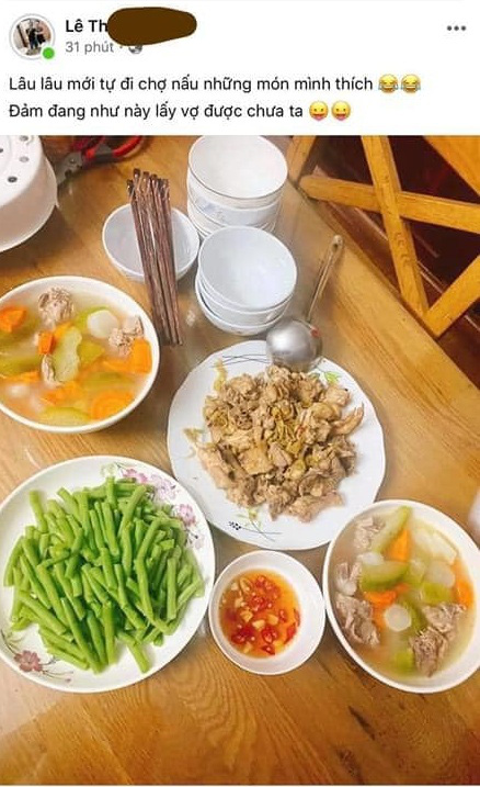 Cụ thể, có một anh chàng nọ đăng ảnh lên khoe mâm cơm do chính mình nấu cùng dòng chú thích: "Lâu lâu mới tự đi chợ nấu những món mình thích. Đảm đang như này lấy vợ được chưa ta".