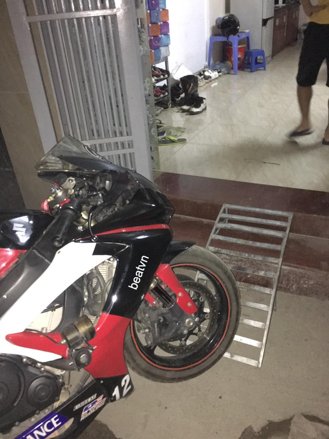 Con xe nặng ngót nghét 200 kg, muốn đưa lên bậc tam cấp thì buộc phải nổ máy, gây tiếng ồn lớn. Nhưng thanh niên này đã nghĩ ra cách xử lý khác.