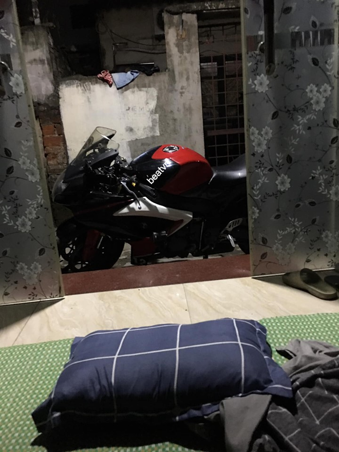 Trong ảnh, anh này mang chăn gối ra gần cửa để nằm trông chiếc xe phân khối lớn. Chiếc xe được cho là mang từ Quảng Ninh lên Hà Nội vào lúc tờ mờ sáng. Nam thanh niên cũng là chủ xe, mang tới nhà bạn để xin ngủ nhờ. Ngặt nỗi, chiếc xe nặng cả trăm cân, muốn đưa lên nhà thì phải nổ máy.