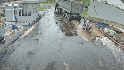 2 người đàn ông điều khiển 1 chiếc xe gắn máy đang dừng chờ gần lề đường, thời điểm chiếc xe gắn máy này dừng, xung quanh gần như không có nguy cơ gây mất an toàn nào, bởi lẽ khoảng cách giữa xe gắn máy và chiếc xe ben ở đó khá xa nhau.