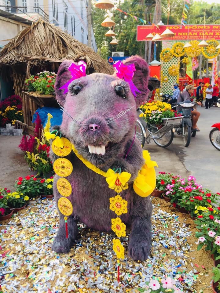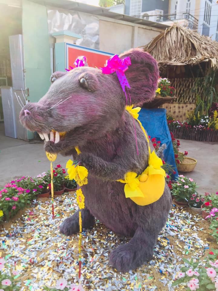 Chú chuột đã được người dân phun màu hồng lên bộ lông, "trang điểm" mặt cho xinh xắn hơn, đồng thời trên người cũng được trang trí thêm màu vàng sặc sỡ từ hoa mai và hoa đồng tiền. Nhìn chú chuột đã lộng lẫy và "đỡ sợ" đi khá nhiều.