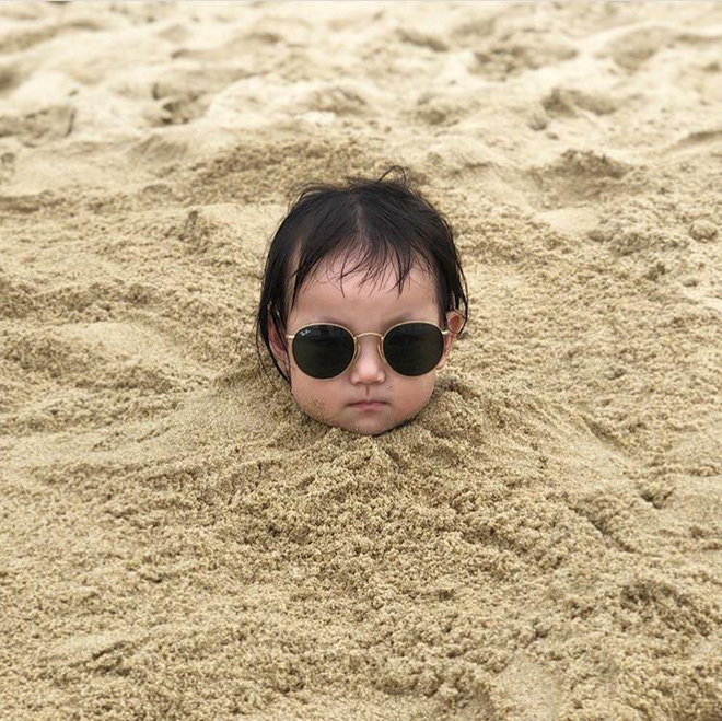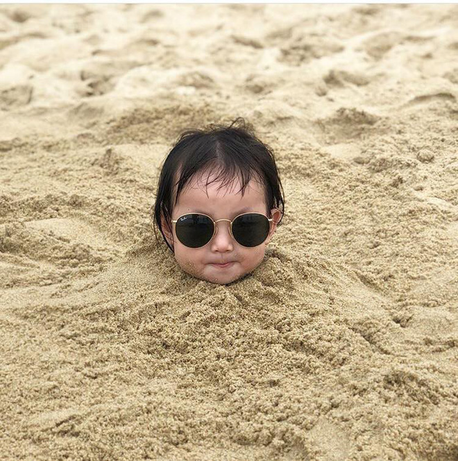 Trong loạt ảnh này, có vẻ như em bé được bố mẹ vùi cả thân trong cát và chỉ còn chừa mỗi cái đầu. Điều đáng nói là biểu cảm hết sức đáng yêu của cô bé này.