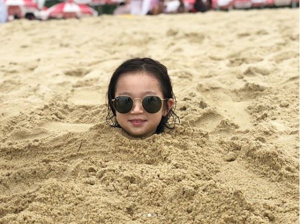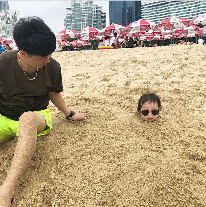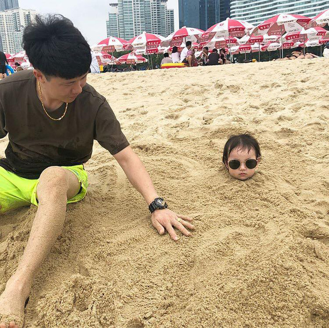 Được biết, đây là một em bé Hàn Quốc và hiện tại bé đang có kỳ nghỉ hè vô cùng vui vẻ bên gia đình ở bãi biển Haeundae Beach. Không chỉ có bé mà chị gái của bé cũng được bố mẹ cho nghịch như thế này.