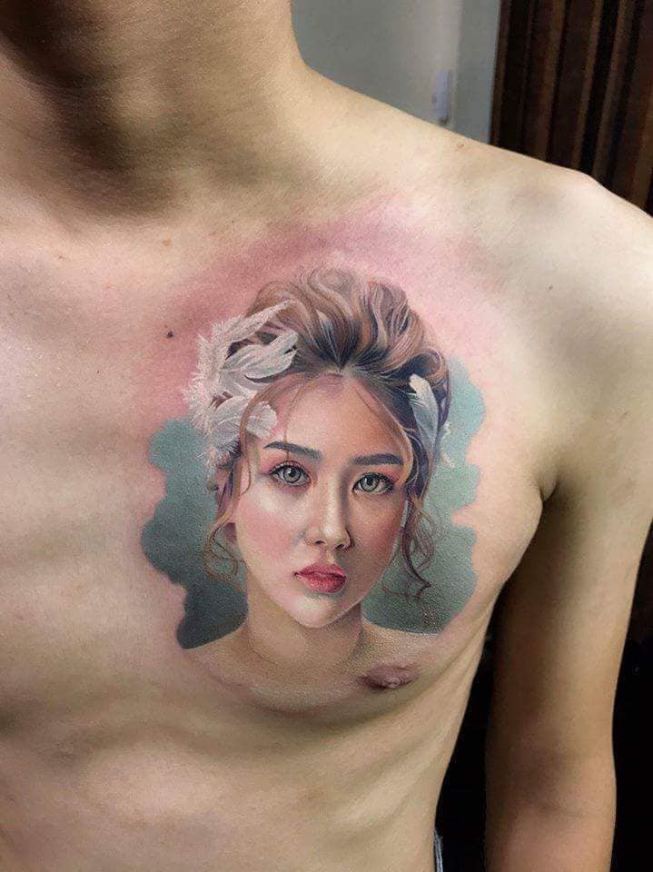 Theo đó, một bên là bức ảnh ghi lại hình ảnh khuôn mặt một cô gái được trang điểm rất xinh xắn, trẻ trung và được thợ xăm khắc họa y như thật trên ngực của chàng trai. Một bên cũng là bức ảnh đó nhưng đã được khổ chủ ''chế'' thêm chiếc khẩu trang để... che đi quá khứ.