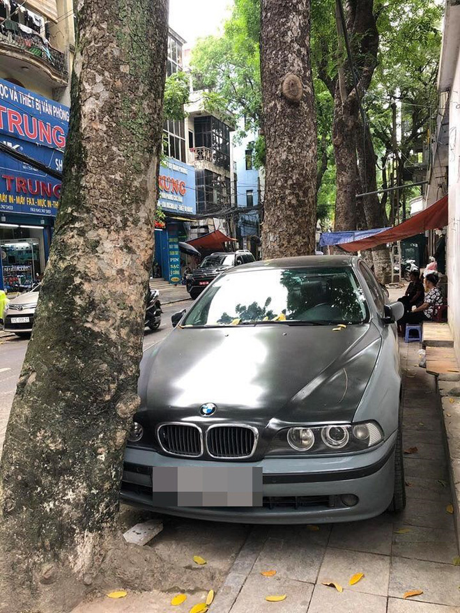 Chủ nhân của chiếc xe BMW trong những bức ảnh dưới đây đã đỗ xe trên vỉa hè, lọt thỏm giữa 2 gốc cây và chừa một phần đường nhỏ cho người đi bộ. Điều đáng nói, cách đỗ này cực kỳ khó khăn bởi hai cây gần như sát đầu, sát đuôi chiếc ô tô.