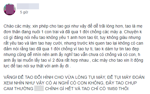 "Em là mẹ đơn thân đang nuôi 1 con trai và đã qua 1 đời chồng các chị ạ. Chuyện không có gì đáng nói nếu em không yêu một anh hơn em 6 tuổi, tuy không giàu nhưng rất yêu em và làm tao hay cười. Nhưng trước khi quen em lại không có can đảm nói rằng em đã qua 1 đời chồng vì em tự ti. Em không dám tự tin em đẹp nhưng cũng dễ nhìn nên anh ấy nghĩ em vẫn chưa có chồng và có con, giờ anh ấy lại muốn lấy em vì 2 đứa rất hợp nhau. Cho em xin ít động lực để nói sự thật với anh ấy đi".