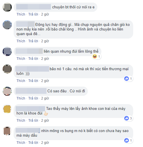 Kèm theo status đầy bối rối khó xử của N. là bức ảnh không liên quan cho lắm, đó là... ảnh chụp chân với đùi (!) Thế nên, thay vì chung tay động viên bà mẹ trẻ nói hết mọi sự tình với bạn trai thì dân mạng lên tiếng chỉ trích cô khá gay gắt. "Kể chuyện 1 đằng đăng ảnh 1 nẻo, mục đích chính của chị là khoe thân thả thính à?"; "Vô duyên quá chị gái gì ơi, mãi mới tìm được người tốt thương mình sao không chia sẻ ảnh 2 người cho bọn tôi chúc phúc, lại đi post cái ảnh hở hang"; "Đùi có đẹp gì đâu mà phô ra vậy trời"...