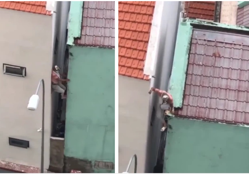 Theo dõi đoạn clip có thể thấy, nam thanh niên này đã chui lên mái nhà, rồi lợi dụng khoảng cách hẹp giữa 2 dãy nhà rồi men theo tường, từ từ xuống đất. Đáng nói, toàn bộ hành động nguy hiểm này chỉ diễn ra khoảng chừng 1 phút ngắn ngủi.