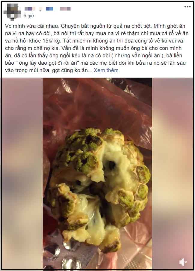 "Vợ chồng mình vừa cãi nhau. Chuyện bắt nguồn từ quả na chết tiệt. Mình ghét ăn na vì na hay có giòi. Bà nội thì rất hay mua na vì rẻ thậm chí mua cả rổ về ăn và hồ hởi khoe 15k/kg.