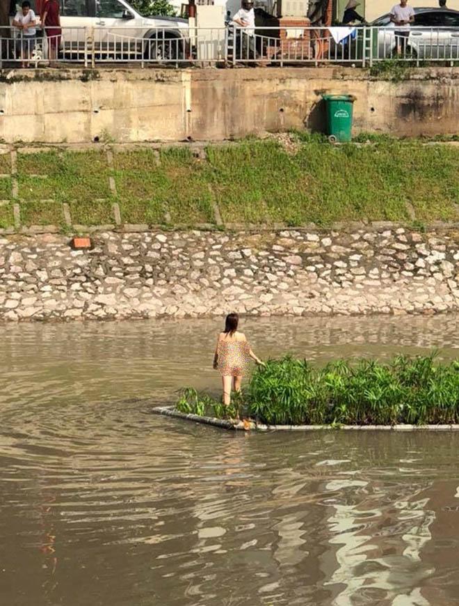 Cô gái mặc đồ lót đứng trên bè rau giữa sông Tô Lịch thu hút sự chú ý của nhiều người