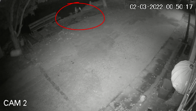 Lúc này, chủ nhà cầm điện thoại ra soi đèn và quay clip lại thì không thấy gì nữa. Người chủ nhà cầm cây gậy lớn ra dòm ngó khắp xung quanh để tìm dấu vết tạo ra tiếng động nhưng cũng không có kết quả, chỉ thấy thùng rác bị bới tung.