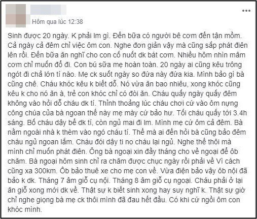 Con bú sữa mẹ hoàn toàn. 20 ngày ai cũng kêu trông ngót đi chả lớn tí nào. Mẹ chồng suốt ngày so đứa này đứa kia. Mình bảo gì bà cũng chê. Cháu khóc kêu không biết dỗ…"