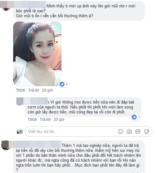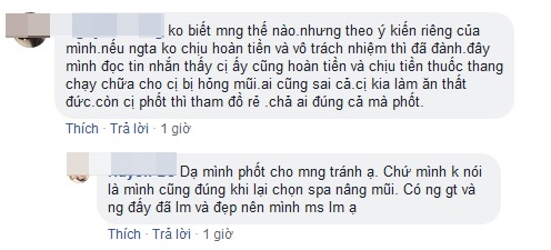 Bên cạnh các ý kiến bênh vực chủ nhân status, nhiều người lại cho rằng: "Người ta đã hoàn tiền rồi bạn còn muốn thêm nữa. Thẩm mỹ hên xui may rủi với một phần mình ham chỗ rẻ chứ sao đổ hết trách nhiệm lên người khác. Với lại, người ta cũng đã có trách nhiệm với bạn rồi. Mục đích bạn phốt lên đây để làm gì?".