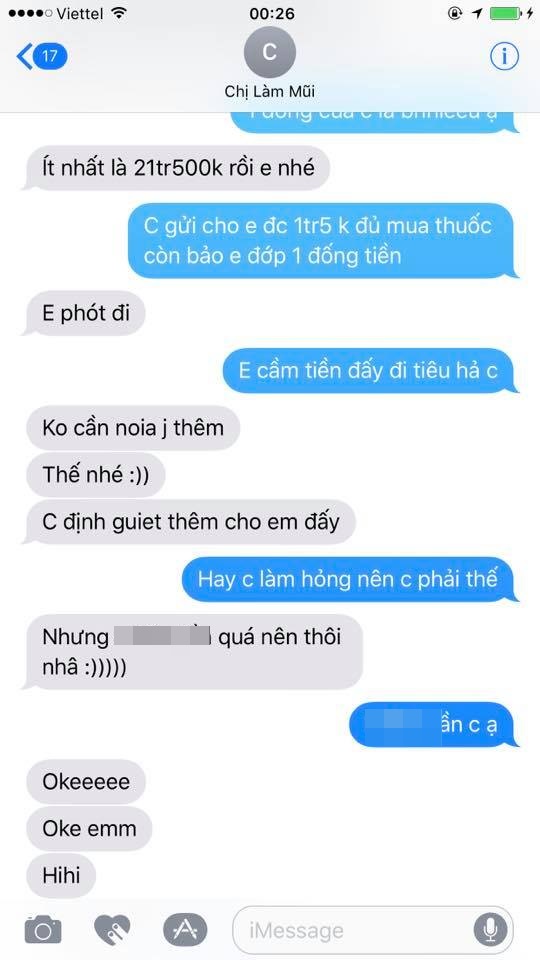 Theo như đoạn tin nhắn giữa cả hai, trong quá trình hỏng mũi sau phẫu thuật, chủ Spa đã hoàn trả tiền phẫu thuật và tiền thuốc thang cho cô gái điều trị, tổng số tiền là 21,5 triệu đồng. Chủ Spa cũng lên tiếng xin lỗi về trách nhiệm của mình. Đến nay, mũi của H.B tuy đã lành lặn nhưng cô gái vẫn muốn đòi thêm tiền đền bù thiệt hại.
