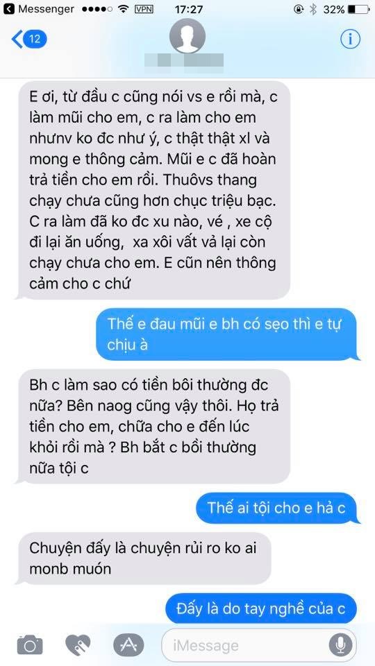 Khi đó, bạn ấy không nói gì đến tiền bồi thường mà chỉ muốn chữa khỏi mũi. Sau đó, bạn ấy quay lại đòi tiền bồi thường thì tôi không thể đáp ứng được".
