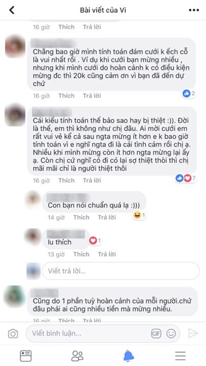 Bạn T.H bày tỏ: “Theo quan điểm của mình, cưới xin người ta đến dự mừng hạnh phúc mình là vui lắm rồi. Mình chả quan trọng mình mừng họ thế nào thì họ phải mừng trả như thế.