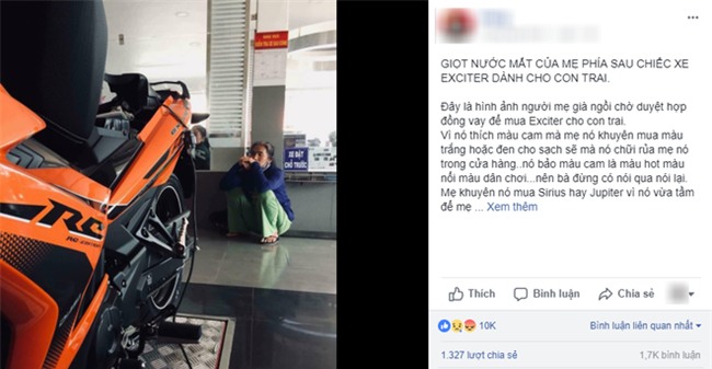 Câu chuyện này, vừa mới được đăng trên một trang mạng xã hội có rất đông thành viên ngay lập tức đã thu hút rất nhiều sự quan tâm của cộng đồng. Tất cả những ai đọc qua và nhìn cái hình ảnh người mẹ khắc khổ đang ngồi nghĩ về cái giá chua chát mà mình phải bỏ ra để mua cho đứa con trai chiếc xe màu cam cũng như lời đối đáp kia thì đều phẫn nộ trước đứa con vòi vĩnh đua đòi này.
