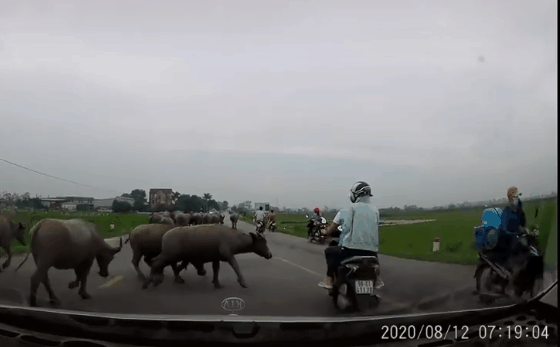 Ngay khi anh tăng ga, định vượt lên trước thì bị 2 con trâu húc trúng. Khi họ ngã, chiếc xe máy đi bên cạnh đã kịp vọt lên để tránh va chạm. Hơn nữa, bên đường là ruộng lúa, may mắn là 2 nạn nhân không bị ngã văng xuống đó.