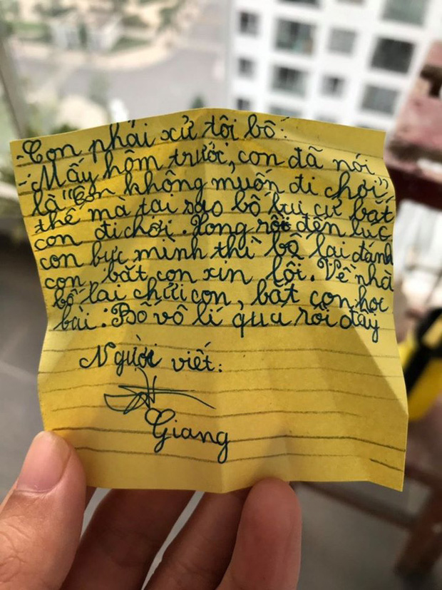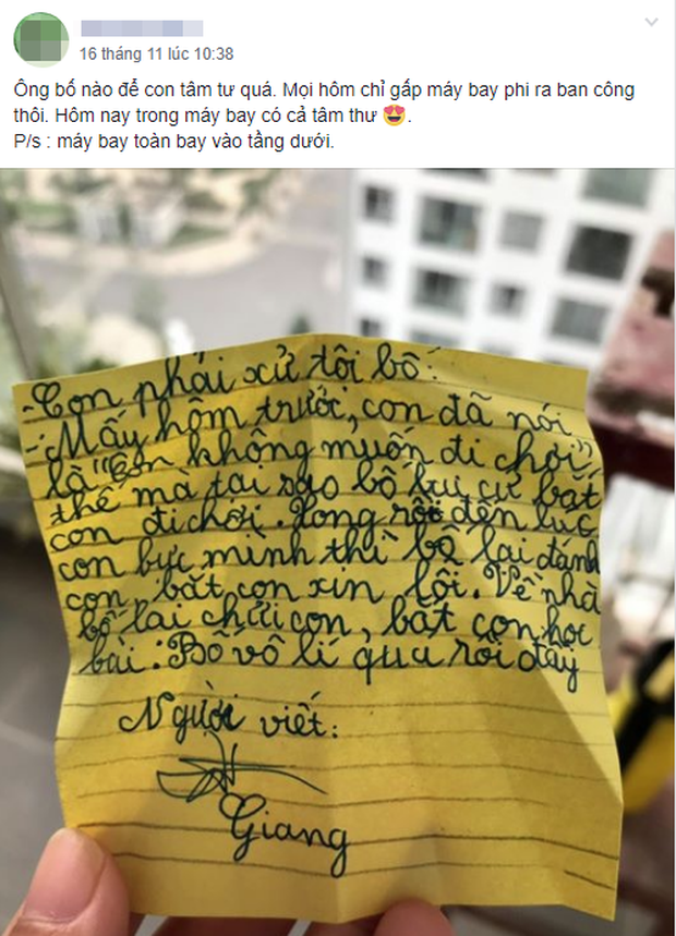 Chủ nhân của tâm thư là một cô bé tên Giang. Có lẽ ấm ức với bố mà không nói ra được nên bé đành trút giận vào máy bay giấy, sau đó cẩn thận ký tên bên dưới.