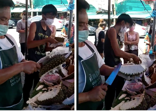 Thông thường, sầu riêng được người mua về bổ dọc rồi tiếp tục tách ra để lấy ra nguyên vẹn các múi bên trong. Nhưng trong đoạn clip trên, người đàn ông Thái Lan đã dùng con dao bén chém nhanh từng múi của trái sầu riêng.