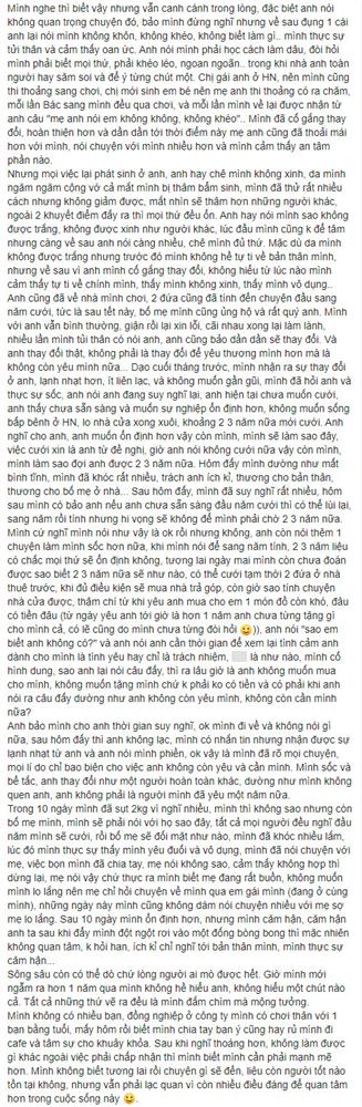 "Anh nói rằng hiện tại chưa muốn cưới, anh thấy chưa sẵn sàng và muốn sự nghiệp ổn định hơn, không muốn sống bấp bênh ở Hà Nội. Dự định 2-3 năm nữa mới tính tiếp chuyện cưới " - cô gái tâm sự.