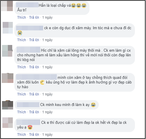 "Có thể chồng bạn ý không thích xăm thôi, chứ còn đầu tóc quần áo thì vẫn cho diện vô tư thì sao. Các mẹ đừng lên án người ta gay gắt quá. Như chồng mình cũng thế, làm gì cũng được, miễn đừng đi xăm mày."