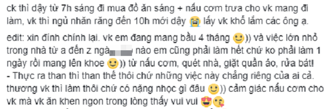 "Chồng thì dậy từ 7 giờ sáng đi mua đồ ăn sáng, nấu cơm trưa cho vợ mang đi làm, vợ thì ngủ nhăn răng đến 10 giờ mới dậy. Lấy vợ khổ lắm các ông ạ! Xin đính chính lại: vợ em đang mang bầu 4 tháng và việc lớn nhỏ trong nhà từ A đến Z ngày nào em cũng phải làm hết chứ không phải làm 1 ngày rồi mang lên khoe. Từ nấu cơm, quét nhà, giặt quần áo, rửa bát. Thực ra than thì than thế thôi chứ những việc này chẳng riêng của ai cả. Thương vợ thì làm thôi chứ có nặng nhọc gì đâu. Cảm giác nấu cơm cho vợ mà vợ ăn khen ngon trong lòng thấy vui vui".