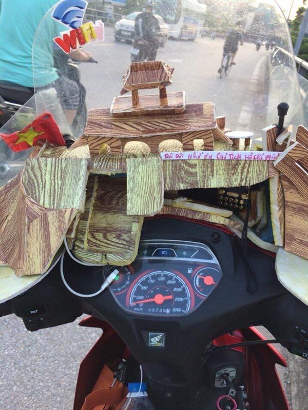 Chiếc xe máy đặc biệt của bố Sương Mai được thiết kể hẳn cả một căn nhà xinh đẹp phía trên.