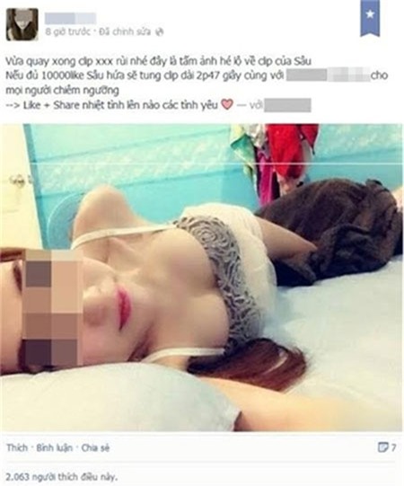 Cũng trong năm 2014, một cô gái trẻ ở Đà Nẵng gây chú ý với cộng đồng facebook bằng cách liên tục đăng tải những tấm ảnh hở hang. Cùng với những bức ảnh đó, trong một trạng thái gần đây, cô nàng còn chia sẻ, cô sẽ đăng tải đoạn clip sex của mình nếu bức ảnh nóng bỏng của cô nhận được 10.000 lượt người like.