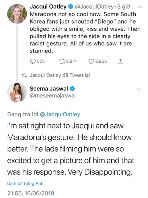 Cựu cầu thủ CLB Napoli đã có mặt trên khán đàn và chứng kiến trận hòa 1-1 của Argentina trước Iceland. Tuy nhiên, sẽ chẳng có gì để nói nếu như nhà báo Jacqui Oatley của BBC, người phụ trách đưa tin trận đấu, không tiết lộ thông tin về Maradona lên trang cá nhân của mình trên mạng xã hội Twitter.