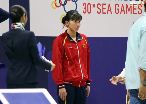 Chỉ đến khi có thành viên ban tổ chức nhắc theo kiểu đùa vui, lúc này Ánh Viên mới trở lại phong thái hồn nhiên như mọi ngày của mình. Ảnh: Hoàng Tùng