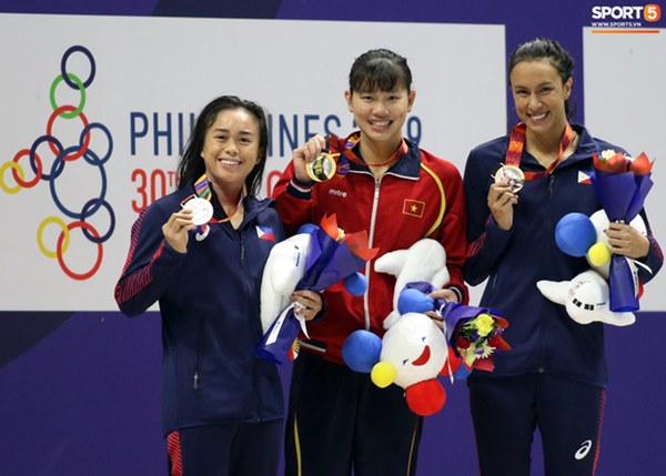 Ánh Viên nhận HCV nội dung 100m ngửa bên cạnh 2 VĐV chủ nhà Philippines. Hiện tuyển bơi Việt Nam đã đạt tổng cộng là 8 HCV, 5 HCB và 6 HCĐ xếp thứ sau tuyển bơi Singapore - 14 HCV, 6 HCB và 3 HCĐ. Ảnh: Hoàng Tùng
