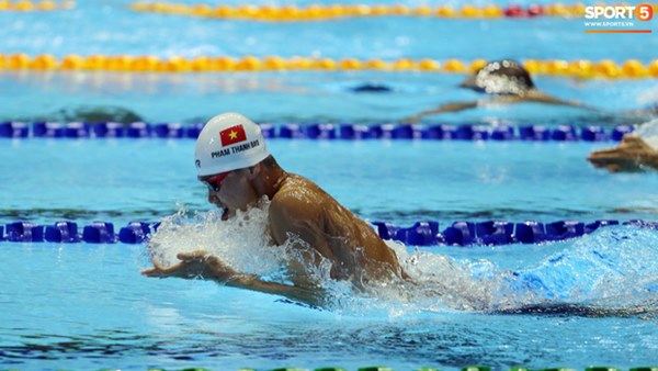 Trong ngày thi đấu 7/12, tuyển bơi Việt Nam chứng kiến màn hụt HCV hi hữu của Phạm Thanh Bảo. Kình ngư sinh năm 2001 đạt thành tích vượt 0,15 giây so với kỷ lục cũ SEA Games nội dung 200m ếch, nhưng vẫn thua đối thủ Ketin Nuttapong (Thái Lan). Cụ thể, Thanh Bảo đạt 2 phút 12 giây 84, Kettin đạt 2 phút 12 giây 57. Ảnh: Thủ Khúc